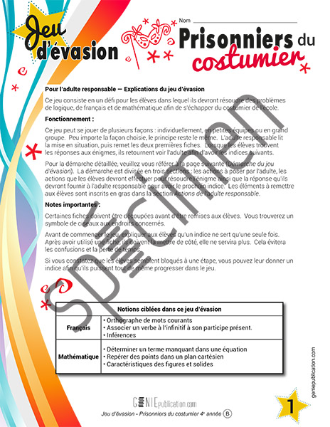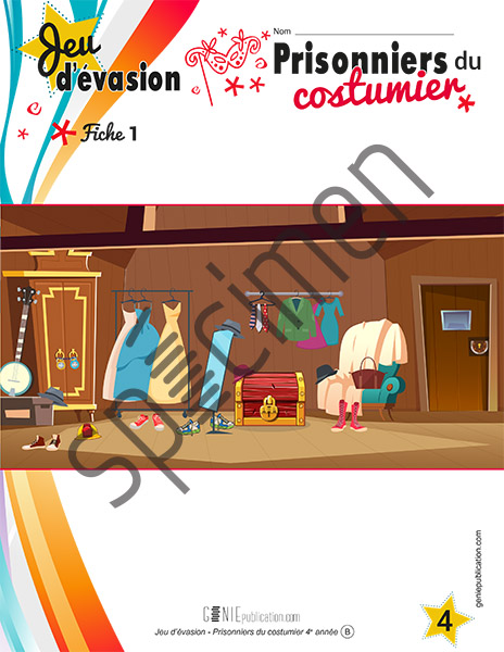 L'élève doit résoudre différentes énigmes de logique, de français et de mathématique pour s'échapper du costumier de l'école. Ce jeu d'évasion comprend les directives à l'adulte ainsi que les fiches des énigmes.