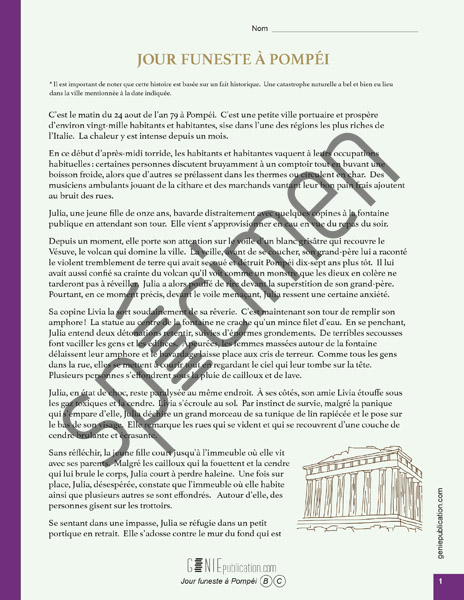 L'élève doit lire un texte qui raconte l'histoire d'une jeune fille lors de l'éruption du Vésuve en l'an 79. Ensuite, l'élève doit répondre à des questions de compréhension. La page Charades – Jour funeste à Pompéi peut être utilisée en complément, puisque les mots sont tirés du texte.