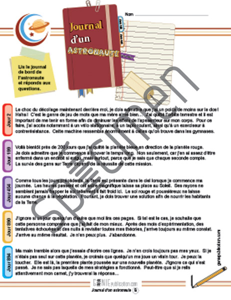 Activité dans laquelle l'lève doit lire le journal d'un astronaute et répondre à des questions sur le texte.