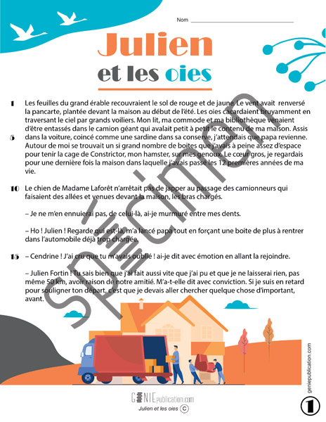 Julien déménage. Il attend que les déménageurs et son père embarquent les dernières boites dans le camion. Avant de partir, son amie Cendrine vient lui dire au revoir. Ce texte raconte la grande amitié de Julien et Cendrine qui, l’espèrent-ils, saura perdurer malgré la distance. À la suite de sa lecture, l’élève est invité à répondre à des questions sur sa compréhension du texte.