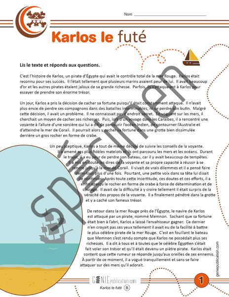 L'élève lit le texte qui parle du pirate Karlos et réponds aux questions.