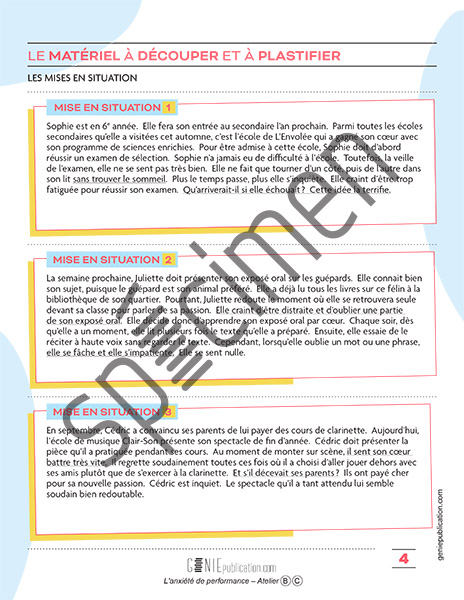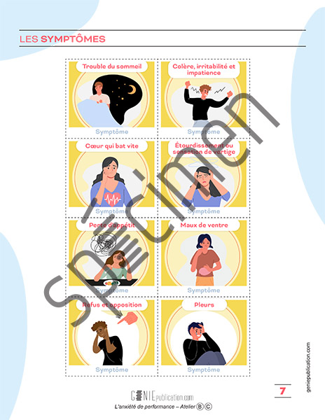 Dans cet atelier, l’élève lit une mise en situation présentant une personne éprouvant de l’anxiété de performance. Il doit ensuite y associer les cartes symptôme, piège, et solution qui lui correspondent.