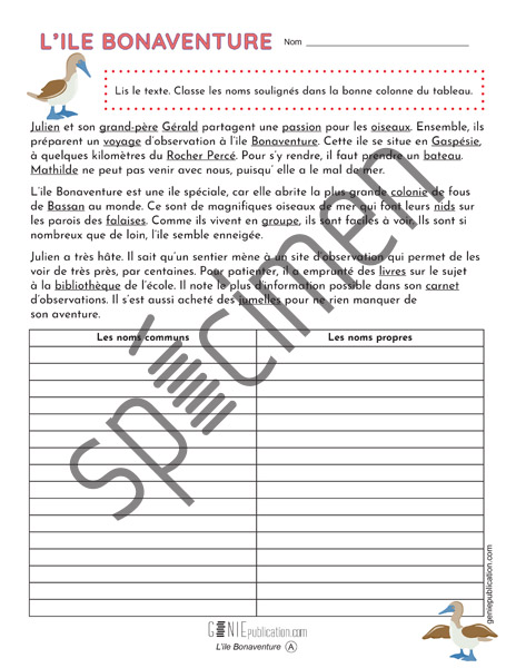 Julien prépare un voyage à l’ile Bonaventure avec son grand-père pour aller observer les fous de Bassan. À la suite de la lecture de ce court texte, l’élève doit classer les mots soulignés pour indiquer s’il s’agit de noms communs ou de noms propres.