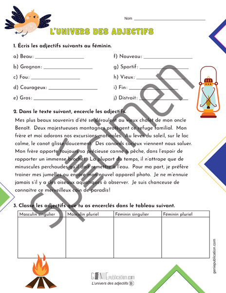 L’élève doit conjuguer, identifier des adjectifs dans un texte et les classer selon leur genre et leur nombre.
