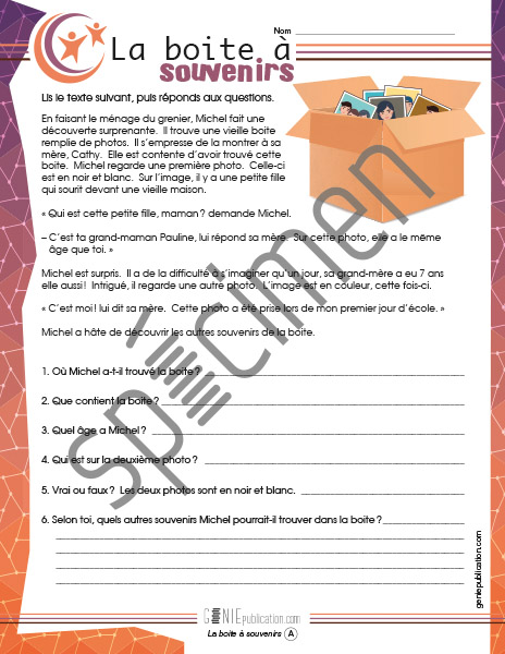 L'élève doit lire un texte sur une boite à souvenirs et répondre à des questions.