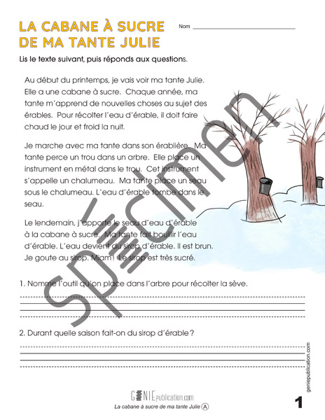Un élève raconte son séjour dans l’érablière de sa tante Julie. L’élève découvre les différentes étapes pour faire du sirop d’érable. Le texte est suivi de questions.