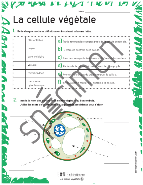 L'élève doit d'abord associer les noms de certaines parties de la cellule végétale à de brèves définitions. Il doit ensuite situer correctement ces parties sur un schéma représentant une cellule végétale. 1 page d'exercices avec le corrigé. Que représentent les lettres encerclées au bas de la page ?
