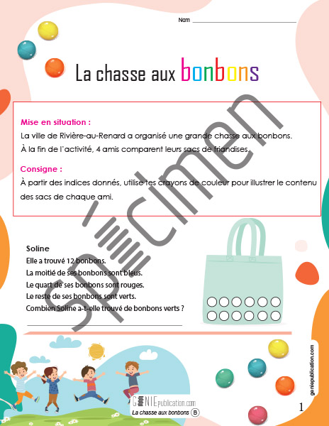 Quelle fraction représente le nombre de bonbons rouges ? L’élève lit des mises en situation et répond à des questions. Il doit aussi colorier les bonbons pour indiquer combien il y en a de chaque couleur.