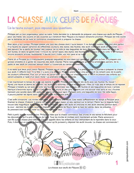 L'élève lit le texte sur une chasse aux œufs et répond aux questions.