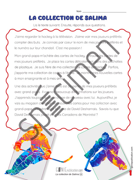 Salima parle de sa collection de cartes de hockey. À la suite de sa lecture, l'élève est invité à répondre à des questions sur sa compréhension.