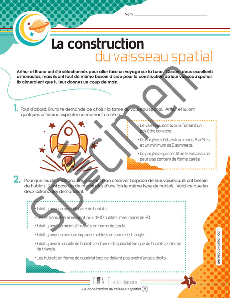 Situation problème dans laquelle l'élève doit aider des personnages à construire un vaisseau spatial avec des formes géométriques.