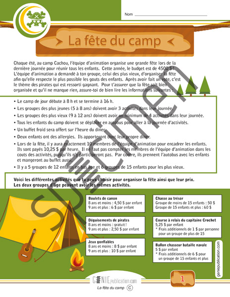 Situation-problème dans laquelle l'élève doit calculer le cout total de la fête du camp Cachou sous le thème des pirates.