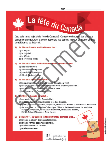 L'élève doit compléter des phrases au sujet de la fête du Canada.