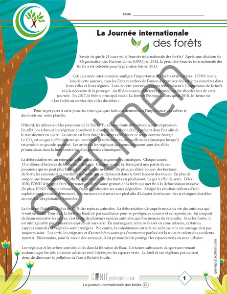 L'élève doit lire un texte sur le thème de la Journée internationale des forêts, puis répondre à des questions.