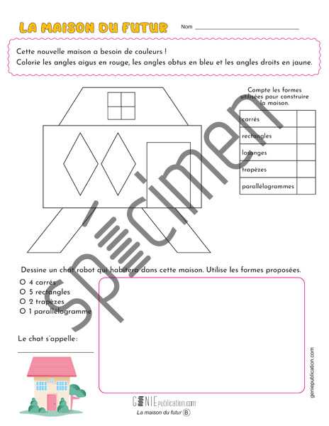 L’élève doit identifier les formes et colorier les angles aigus, droits et obtus de la couleur indiquée.
