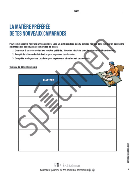 L'élève réalise un sondage auprès de ses camarades de classe, puis doit organiser ses données dans un tableau et un diagramme circulaire.