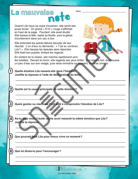 Dans ces activités, l’élève lit une courte histoire et répond ensuite à 6 questions qui lui permettent d’analyser et de comprendre l’émotion ressentie par le personnage principal.