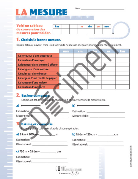 L’élève choisit l’unité de mesure adéquate pour mesurer certains éléments du quotidien.  Il ou elle estime et mesure ensuite la longueur de traits, puis résout des additions en convertissant les différentes mesures métriques.