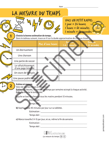 Dans cette activité, l’élève estime et calcule la durée de certains évènements, en heures, en minutes et en secondes.