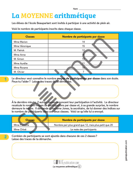 L’école Beauparlant organise une activité de plein air. Le directeur se demande quel est le nombre moyen de participants par classe. L’élève calcule ce nombre et, lorsque des inscriptions de dernière minute s’ajoutent, il doit déterminer combien de participants se sont ajoutés dans chaque classe si le nombre moyen de participants par classe est demeuré le même.