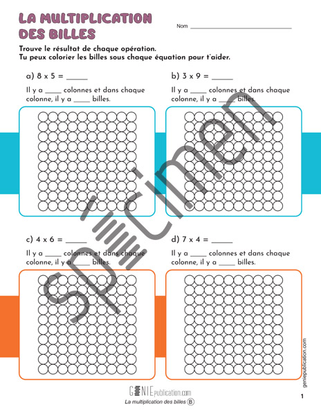 L’élève doit effectuer des multiplications et colorier le nombre de billes approprié.