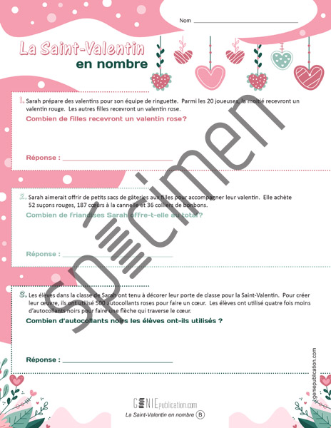 L’élève doit résoudre trois courts problèmes de mathématiques sur le thème de la Saint-Valentin.