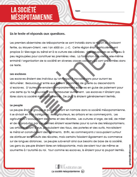 L'élève doit lire un texte sur la société en Mésopotamie et répondre à différentes questions.
