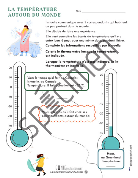 Ismaelle a des amis dans six pays différents. Elle aimerait connaitre la température qu’il fait aujourd’hui dans chacun de ces pays. Dans cette activité, l’élève doit indiquer la bonne température inscrite sur les thermomètres et calculer l’écart de température entre des pays donnés.