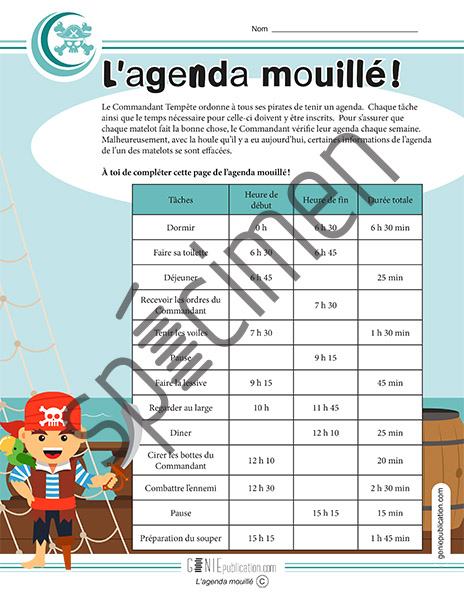 L'élève doit déterminer les heures de début et de fin de plusieurs activités ainsi que la durée de celles-ci.