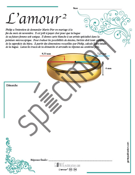 L'élève doit calculer l'aire totale d'une bague en appliquant le concept de l'aire d'un cylindre (aire latérale, aire des bases, aire totale).