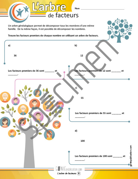 Comme un arbre généalogique, l'élève doit trouver les facteurs premiers de certains nombres.