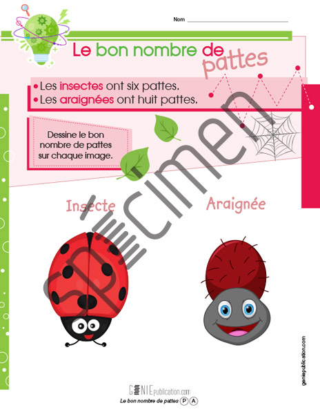 L’élève doit dessiner le bon nombre de pattes à l’insecte et à l’araignée.