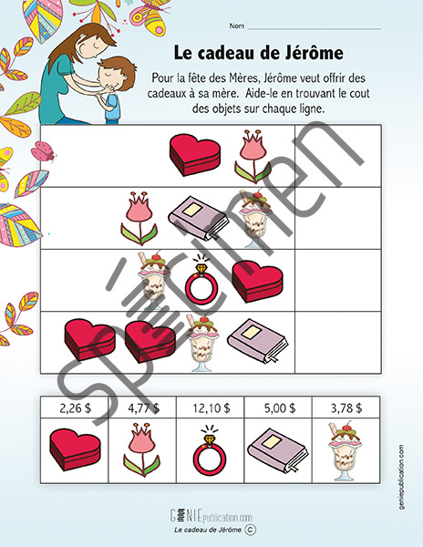 L'élève doit calculer le cout des objets qu'un enfant veut offrir à sa mère comme cadeau.