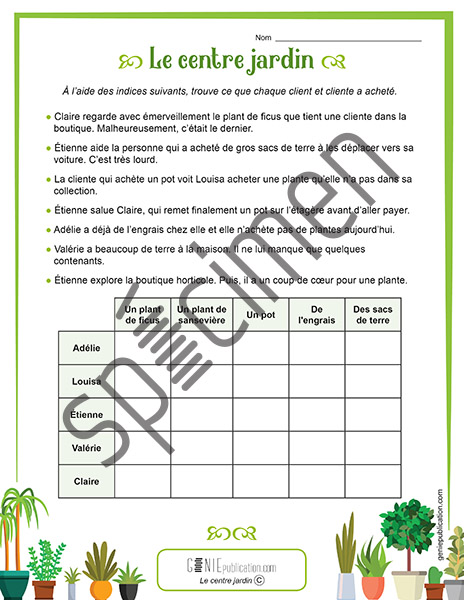 L’élève doit déterminer ce que chaque client et chaque cliente a acheté au centre jardin. Il doit y aller par élimination.