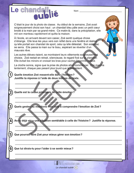 Dans ces activités, l’élève lit une courte histoire et répond ensuite à 6 questions qui lui permettent d’analyser et de comprendre l’émotion ressentie par le personnage principal.