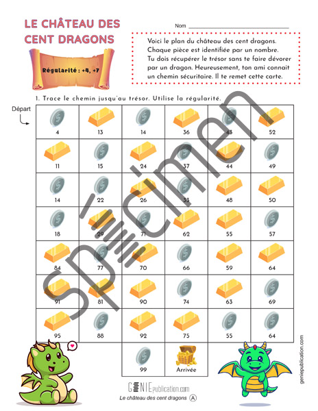 L’élève doit trouver le bon trajet sur une carte en appliquant la régularité, puis dénombrer des éléments pour ouvrir le coffre et connaitre la quantité de pierres magiques qu’il contient.