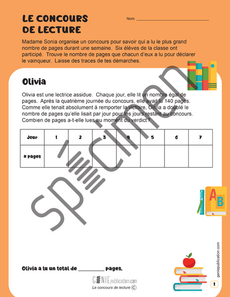 L’élève doit déterminer le nombre de pages par jour qu’ont lu 6 élèves et trouver qui a lu le plus de pages en une semaine.
