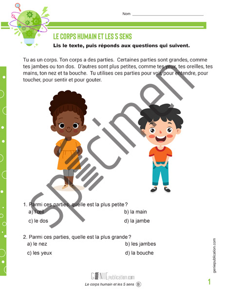 L’élève compare la grosseur de certaines parties du corps humain et observe la fonction des 5 principales parties sensorielles : l’œil, l’oreille, le nez, la bouche et les mains.