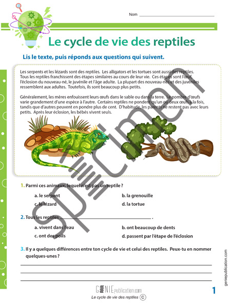 L’élève lit de courts textes sur le cycle de vie des reptiles et répond aux questions qui suivent.