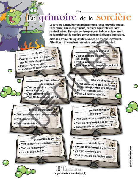 L'élève doit trouver le nombre correspondant à chaque ingrédient de la potion magique à l'aide de différents indices.