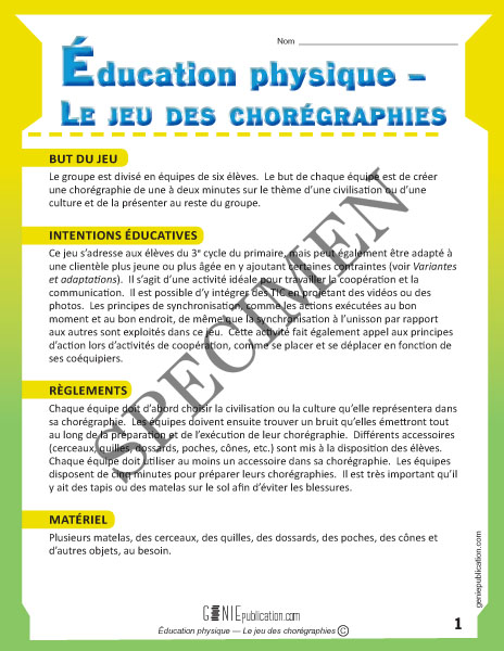 Cette fiche s'adresse aux enseignants en éducation physique de même qu'aux moniteurs de camps de jour. Elle explique les règles et les variantes du jeu des chorégraphies, une activité de coordination et de communication.