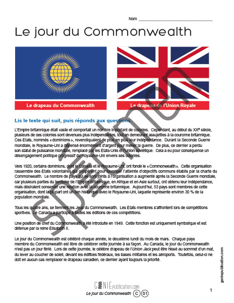 L'élève doit lire un texte sur le Commonwealth et le jour du Commonwealth, puis doit répondre à des questions.