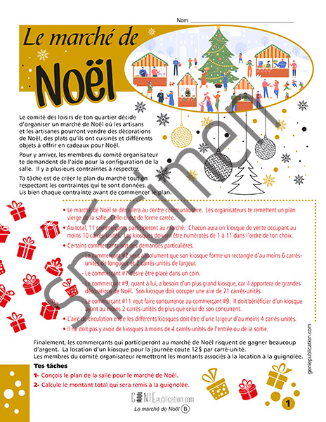 L’élève doit aménager le plan d’une salle pour un marché de Noël. Il doit respecter les contraintes de chaque kiosque.