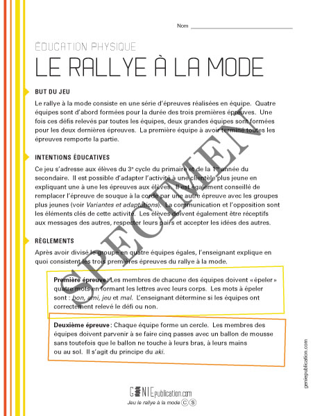 Cette fiche s'adresse aux enseignants en éducation physique de même qu'aux moniteurs de camps de jour. Elle explique les règles et les variantes du rallye à la mode, une activité dans laquelle les élèves doivent relever différents défis en équipe.