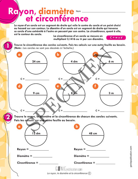 L'élève doit trouver la mesure du rayon, du diamètre et de la circonférence de différents cercles.