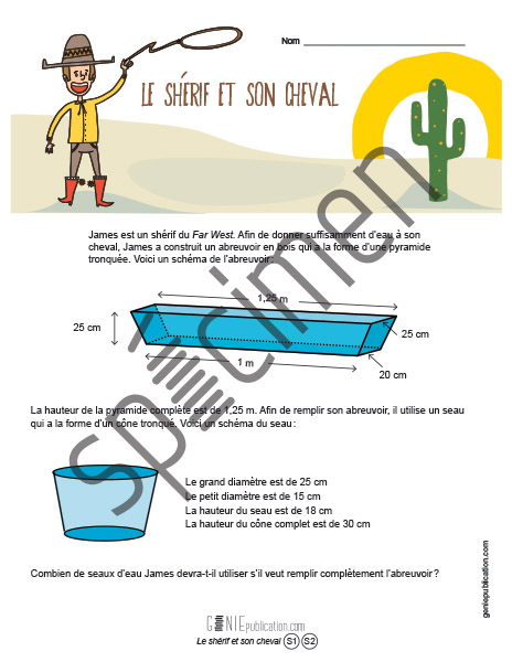 L'élève doit calculer le volume d'une pyramide tronquée et le volume d'un cône tronqué pour calculer le nombre de seaux d'eau nécessaires pour remplir d'eau un abreuvoir.