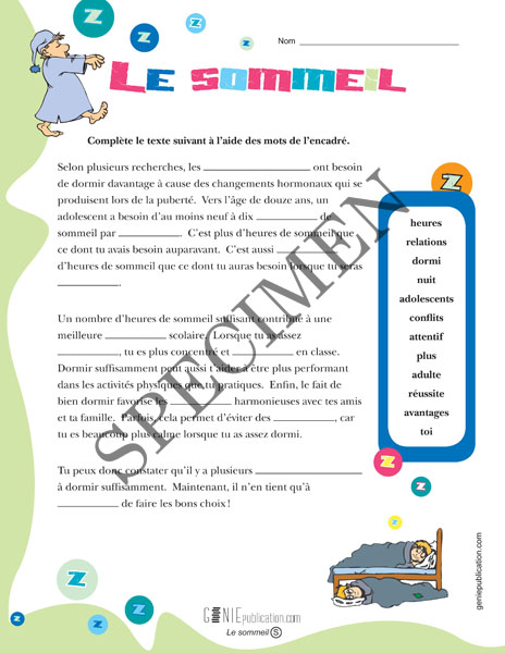 L'élève doit compléter un texte au sujet du sommeil en utilisant les mots de l'encadré.