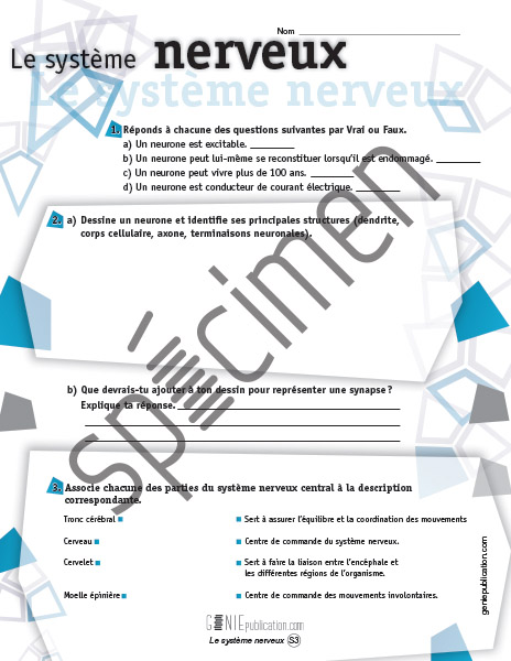 L'élève doit répondre à des questions au sujet des neurones ainsi que des rôles respectifs de chacune des parties du système nerveux central.