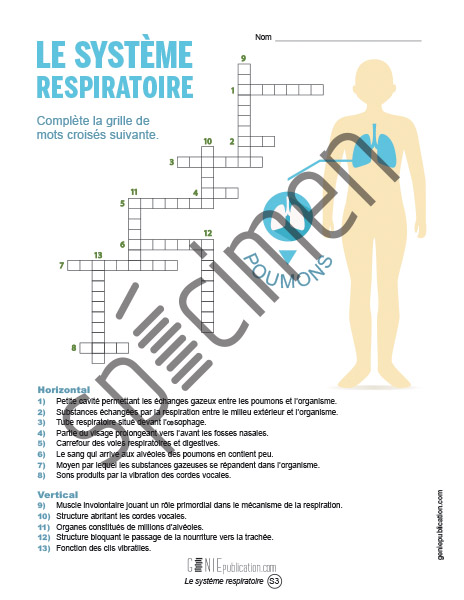 L'élève doit remplir une grille de mots croisés sur le thème du système respiratoire.