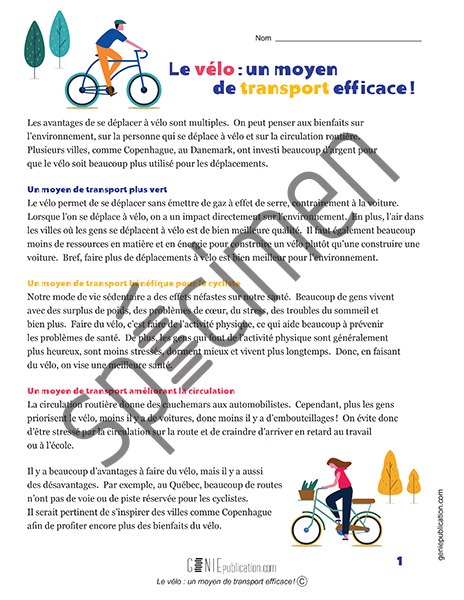 L'élève lit sur les bienfaits du transport à vélo, puis doit réfléchir aux avantages et désavantages de ce moyen de transport.